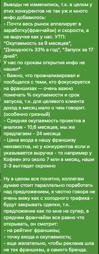 и естественно не забыть проверить свое предложение и сравнить с актуальной рыночной конъюнктурой, условно если в вашем нише обещают окупаемость от 6 месяцев, а вы предлагаете 18, то это делает ваш оффер менее привлекательным.